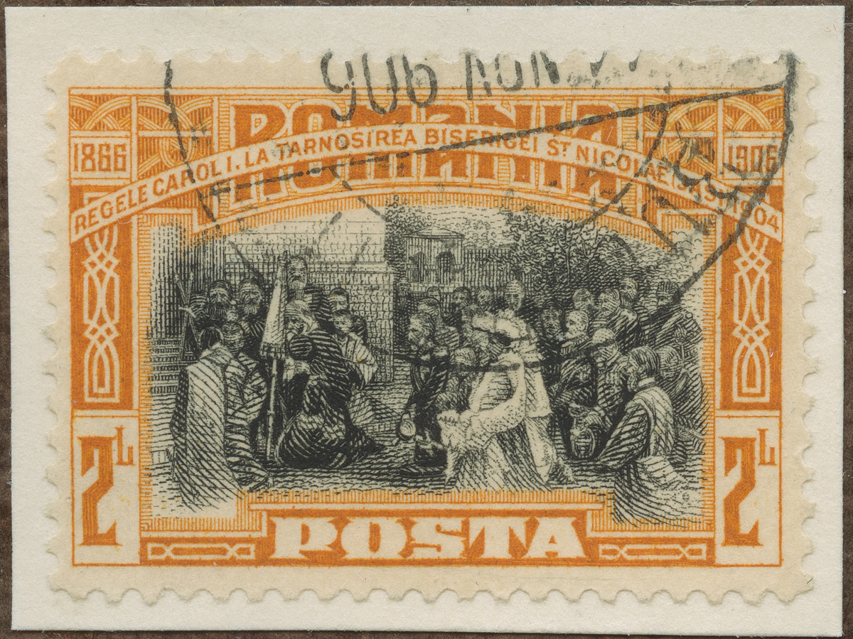 Frimärke från Rumänien, 1906. Motiv av Kung Karl vid den Helige Nikolaus' helgedom 1904 40-årsregering 1866-1906.