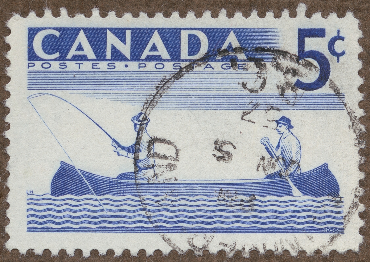 Frimärke från Canada, 1957. Motiv av Canadensisk kanot med fiskare