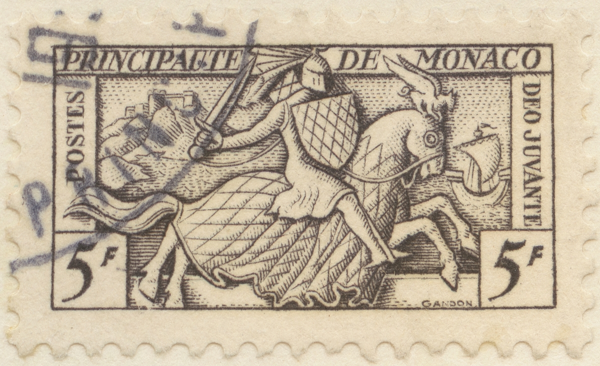 Frimärke från Monaco, 1951. Motiv av Medeltidsriddare med svärd och sköld