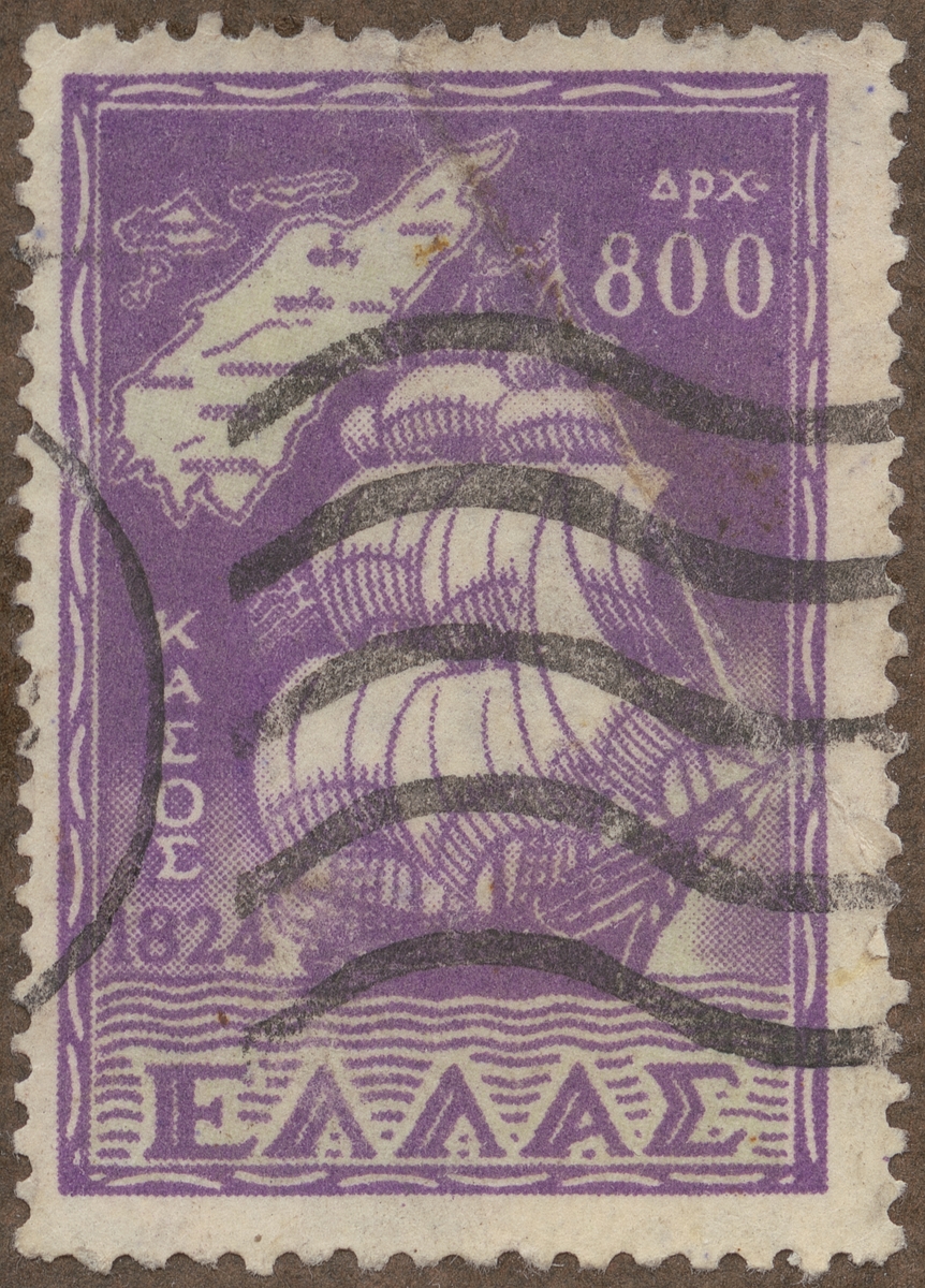 Frimärke från Grekland, 1947. Motiv av Fullriggare av 1824. Karta över ön Kasos. Minne av Dodeca Öarnas införlivning med Grekland.