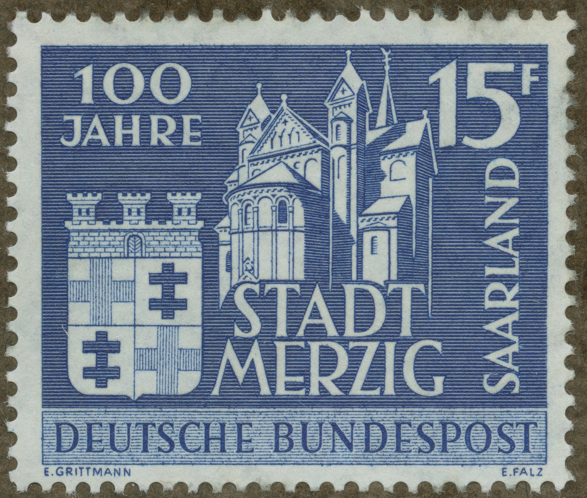 Frimärke från Saar, 1957. Motiv av St. Peterskyrkan i Merzig: Saar. T.v. staden Merzigs vapen. "100-årsminne av staden Merzigs grundläggning: 1857-1957".