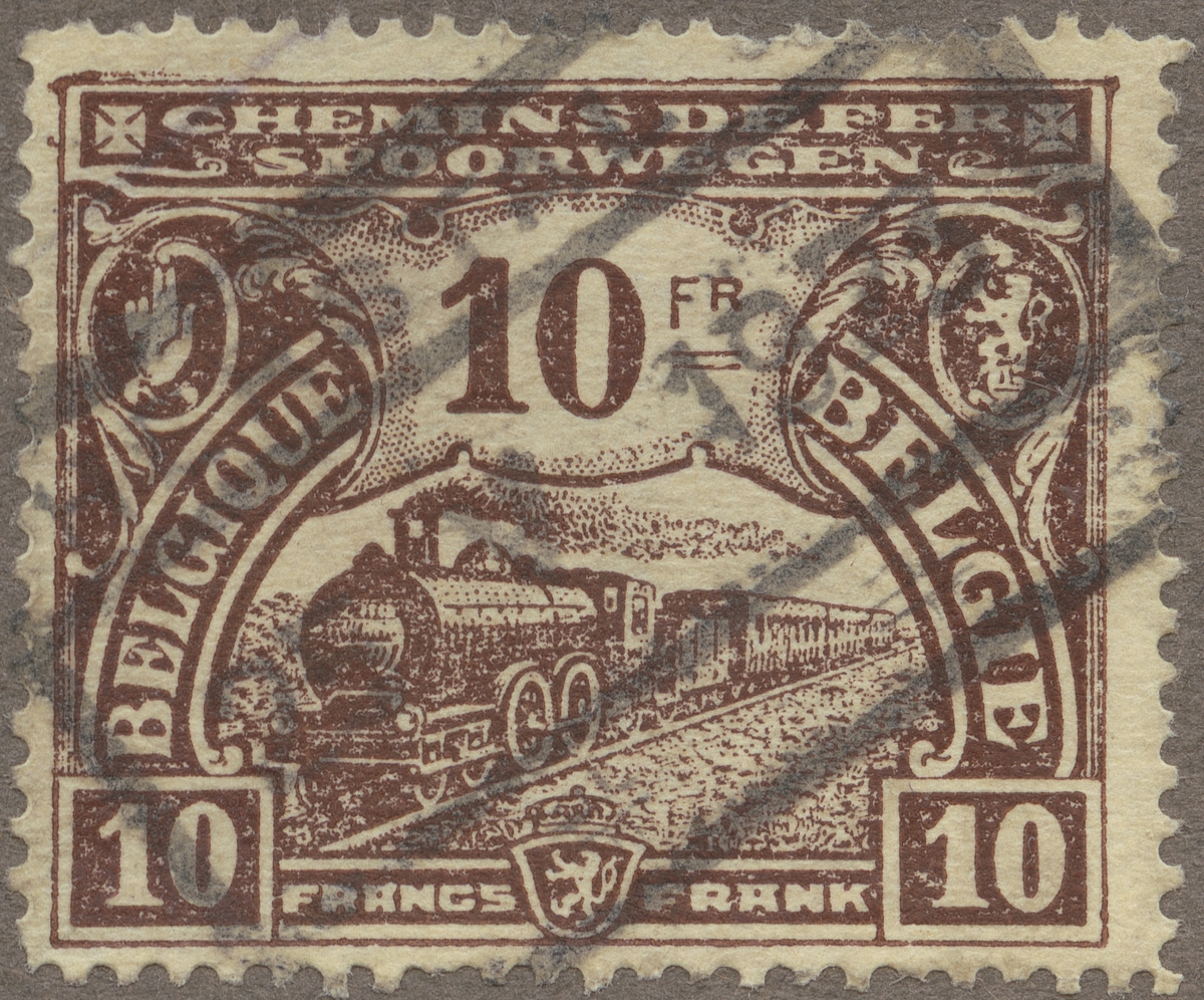 Frimärken ur Gösta Bodmans filatelistiska motivsamling, påbörjad 1950. Frimärke från Belgien, 1920. Motiv av Belgisk järnvägståg ": Paketfrimärke."
