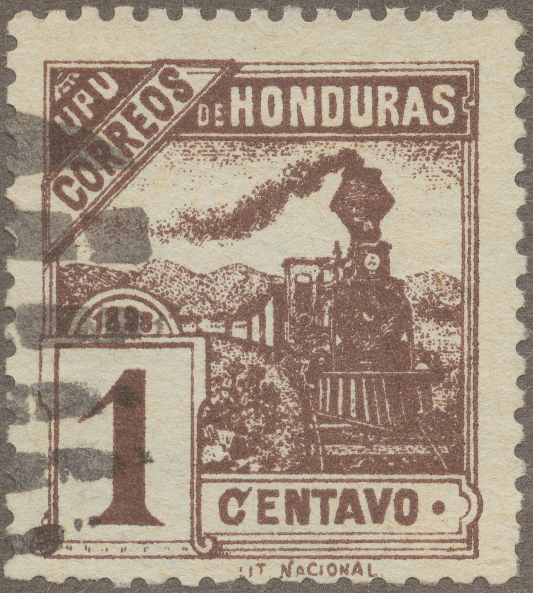 Frimärken ur Gösta Bodmans filatelistiska motivsamling, påbörjad 1950. Frimärke från Honduras, 1898. Motiv av Ånglokomotiv i Honduras, Centralamerika: 1898.