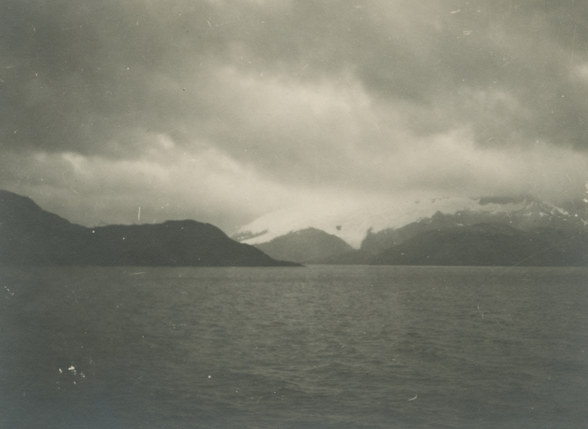 Fotografi från kuvert märkt med "Ernst Nordenskjöld". Vy över hav, berg och molntäckt himmel.