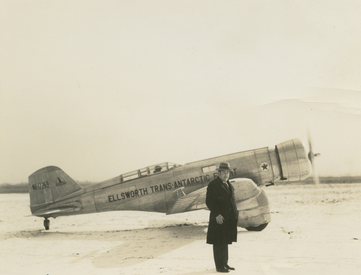Fotografi från låda märkt Bernt Balchen. Balchen var norsk-amerikansk flygare, polarforskare och militär. Motiv av man som står framför flygplan med texten: "Ellsworth Trans-Atlantic Flight".