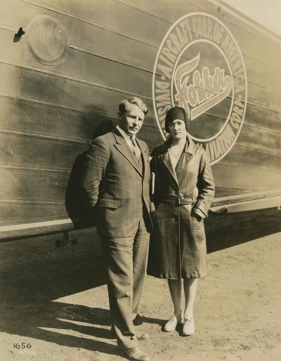 Fotografi från låda märkt Bernt Balchen. Balchen var norsk-amerikansk flygare, polarforskare och militär. Motiv av Balchen som poserar tillsammans med sin nyblivna fru Emmy Balchen (Sörlie). Fotografiet är taget på deras bröllopsdag 1930.