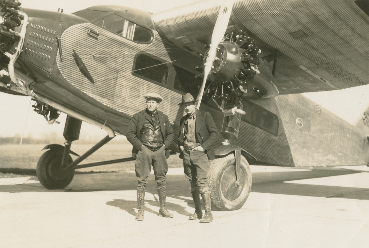 Fotografi från låda märkt Bernt Balchen. Balchen var norsk-amerikansk flygare, polarforskare och militär. Motiv av Bernt Balchen och Floyd Bennet framför Junkersflygplan av typen Ford Trimotor.
