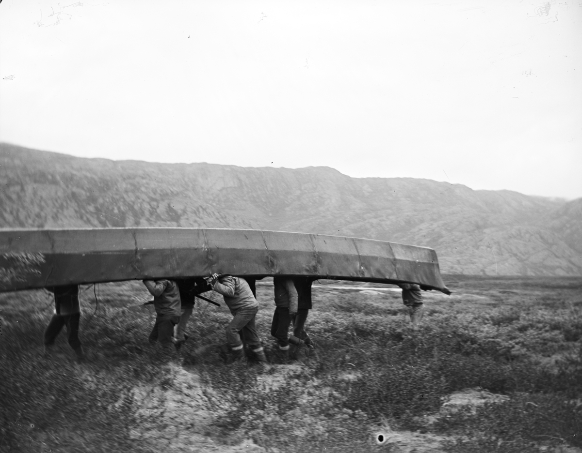 Fotografi från Grönland. Motiv av flera personer som bär på en kanot.