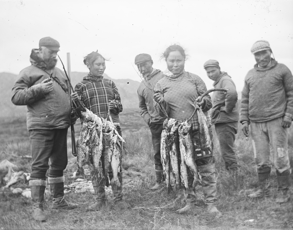 Fotografi från Grönland. Motiv av män och kvinnor som visar upp fångad fisk.