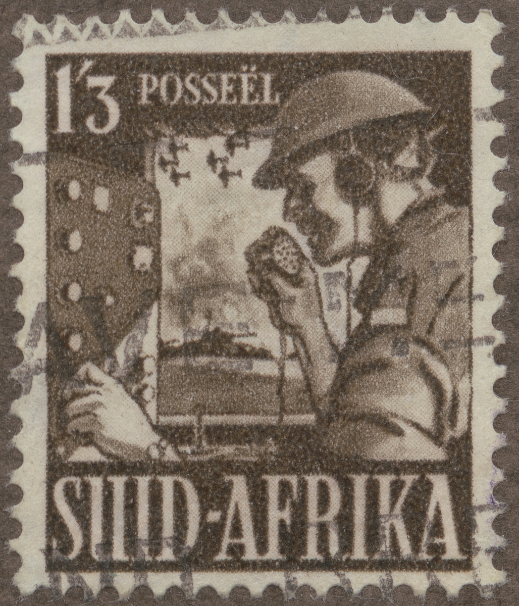 Frimärke ur Gösta Bodmans filatelistiska motivsamling, påbörjad 1950. Frimärke från Sydafrika, 1941. Motiv av Radiotelegrafist