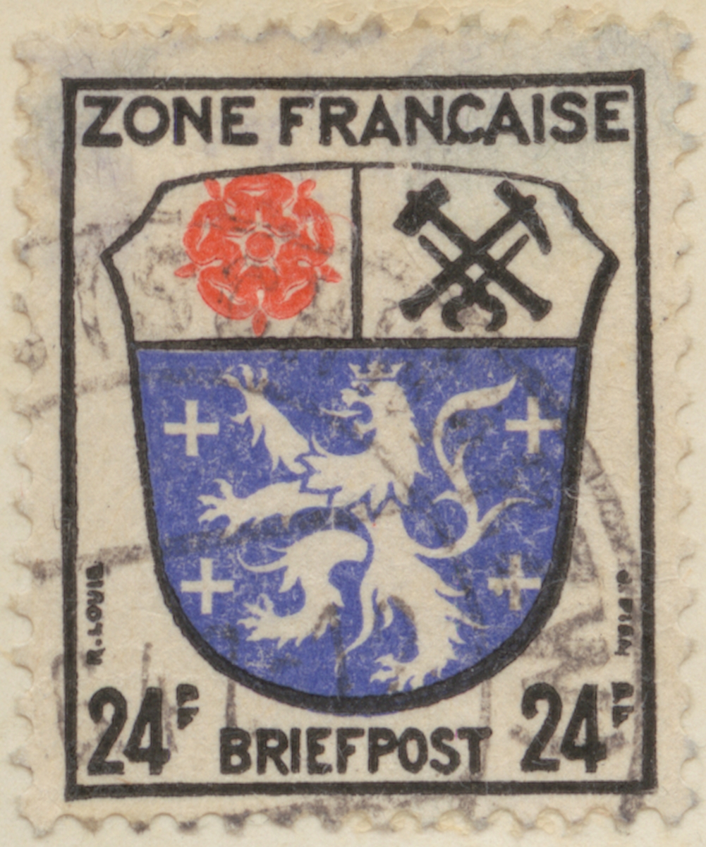 Frimärke från Tyskland (Franska Zonen), 1946. Motiv av Vapen Saarlandet -Franska okkupationen av Tyskland 1946 efter världskrig II-