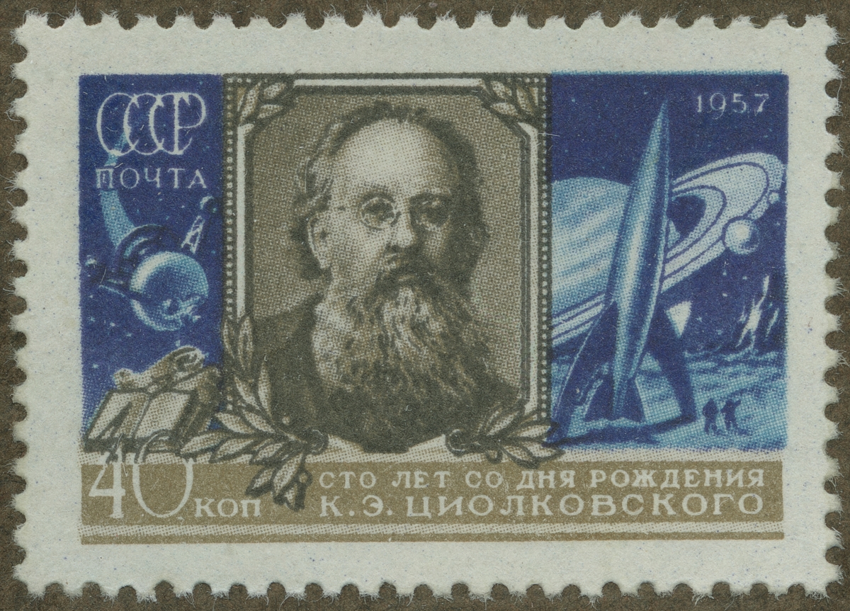 Frimärke från Ryssland, 1957. Motiv av Konstantin E. Tsiolkovsky: f. 1857 d. 1935 Rysk astronautik pionjär -Sputnik (t.v.) i bana runt jorden, landning med raket (t.h.) - 100-årsminne av T:s födelse: 1857-1957.