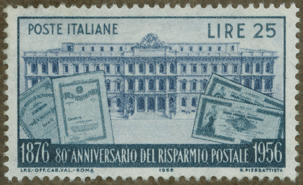 Frimärke från Italien, 1956. Motiv av Huvudpostbyggnaden i Rom Sedlar 80-årsminne Sparbanken "Resparmio Postale" 1876-1956.