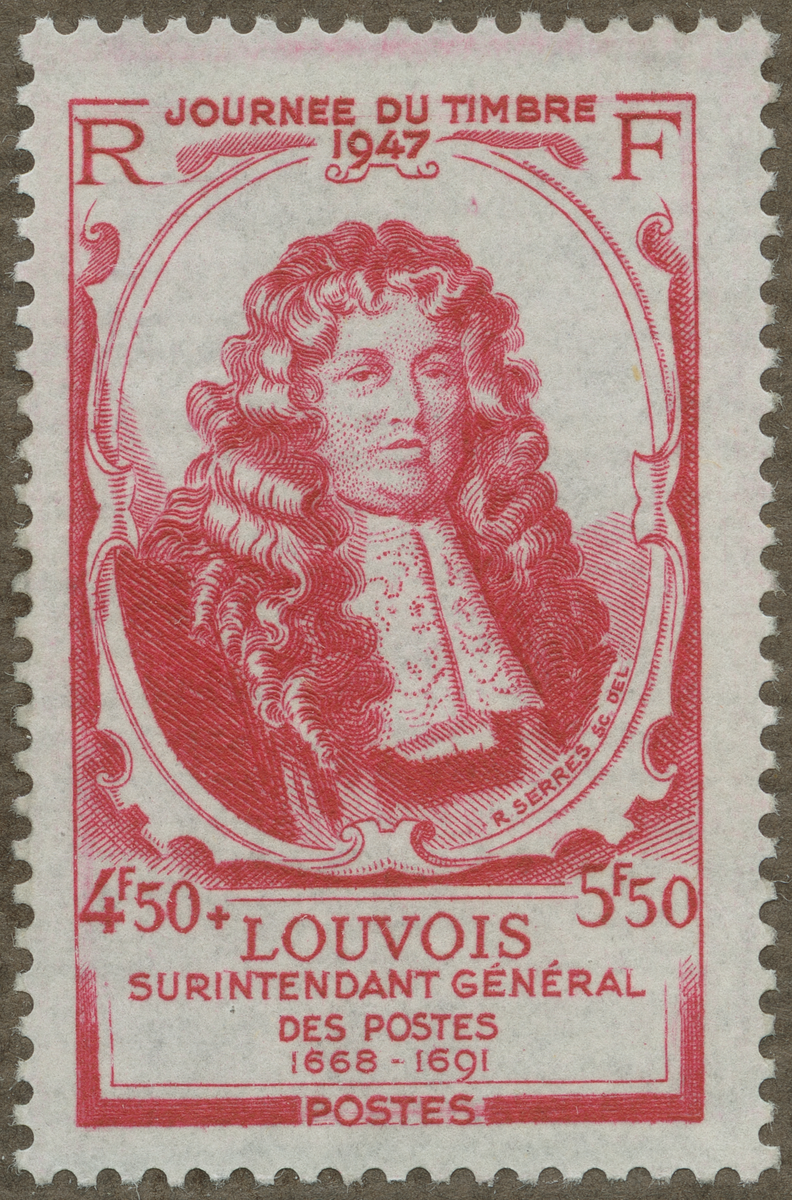 Frimärke från Frankrike, 1935. Motiv av François Michel le Tellier, Marquis de Louvois: 1641-1691. Generalsuperintendent för franska posten: 1668-1691 Frimärkets dag i Frankrike 1947.