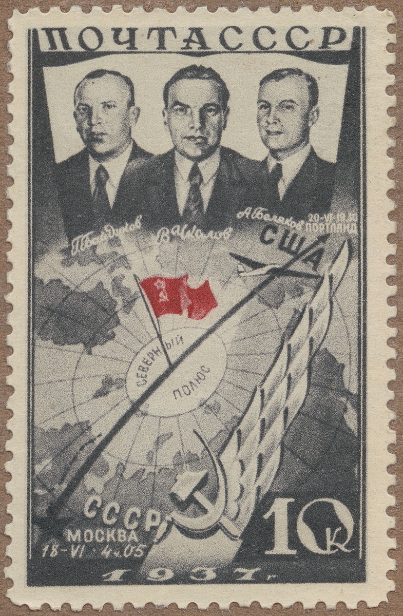 Frimärke från Ryssland, 1938. Motiv av Moskva - New York flygning över Nordpolen. "Märket utgivet med anledning av en år 1937 företagen flygning från Moskva till New York över Nordpolen. Företogs i flygmaskinen ANT 25 med bl.a. de ryska flygarna Tsjkalov, Bajdukov och Beljakov ombord."