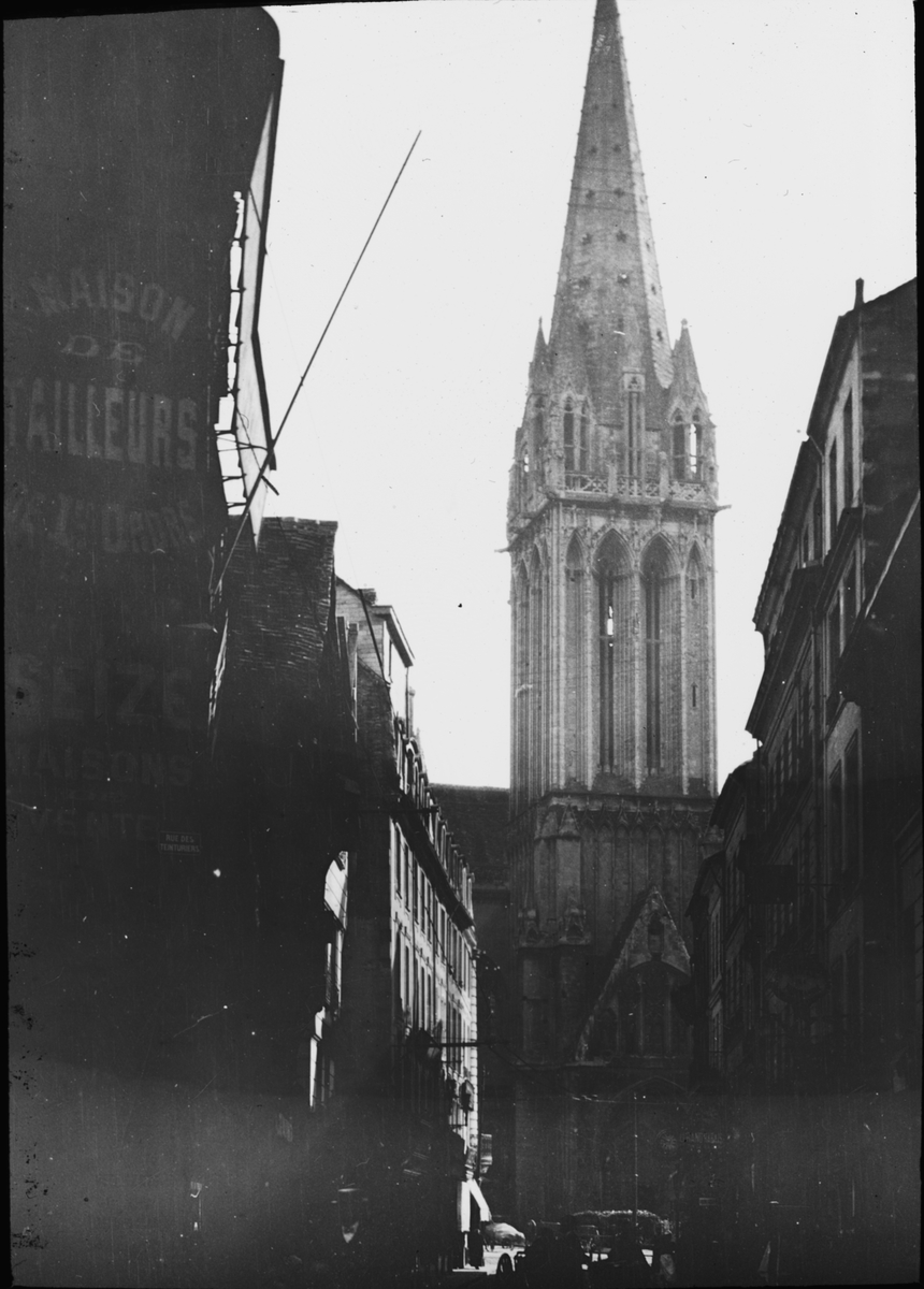 Skioptikonbild med motiv från Caen med catedralen Saint Pierre i bakgrunden. (Staden förstördes delvis i kriget 1944).