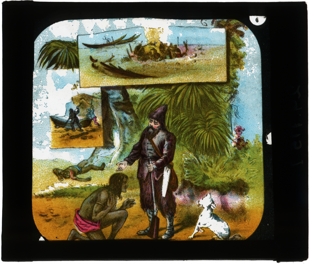 7. Robinson ser kannibaler på stranden och räddar en fånge som får namnet Fredag.