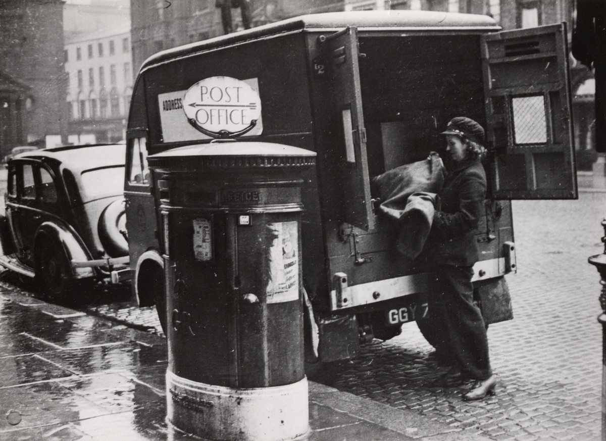 Elbil i det engelska postväsendets tjänst 1943. Den uppsamlade posten lastas på bilen av den kvinnliga chauffören.