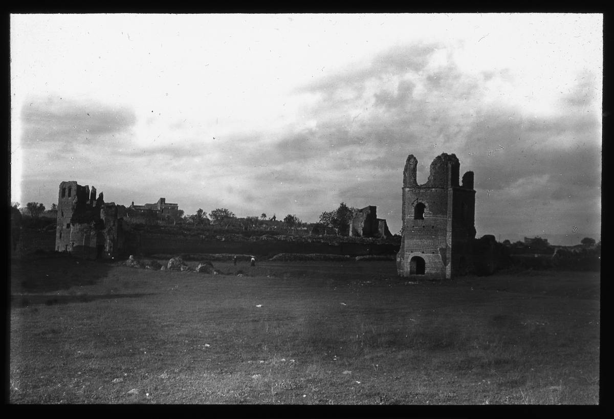 Skioptikonbild från institutionen för fotografi vid Kungliga Tekniska Högskolan. Motiv föreställande en ruin Rom. Bilden är troligen tagen av John Hertzberg under en resa i Europa.