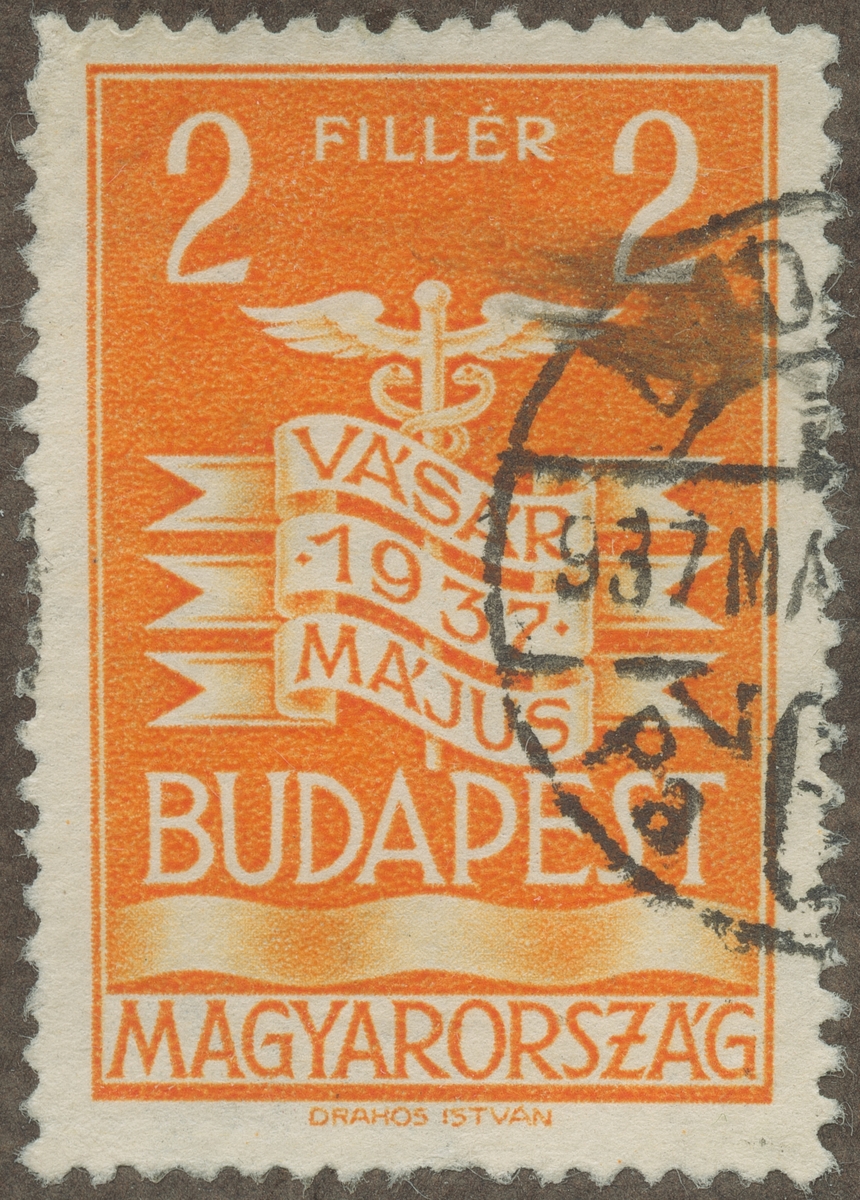Frimärke från Ungern, 1937. Motiv av Symboler för Budapest mässan.