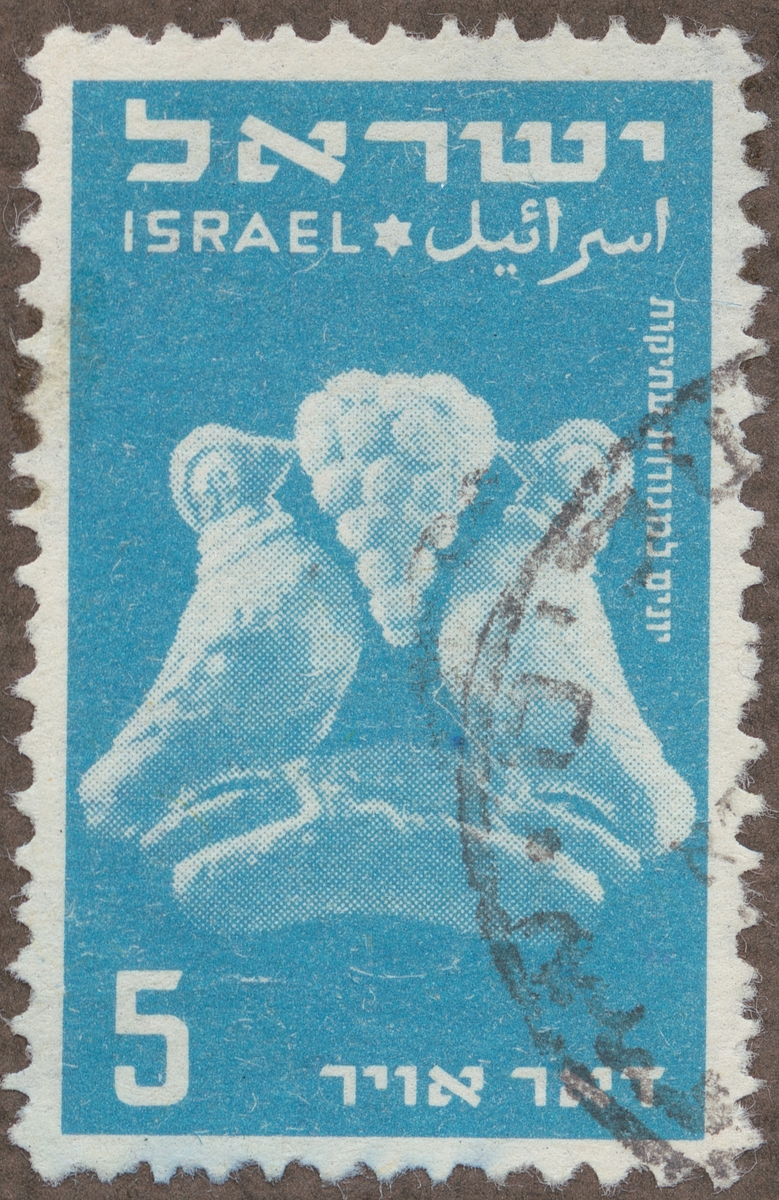 Frimärke från Israel, 1950. Motiv av druvklase och duvor. "Symbol för vinodlingar och luftpost".