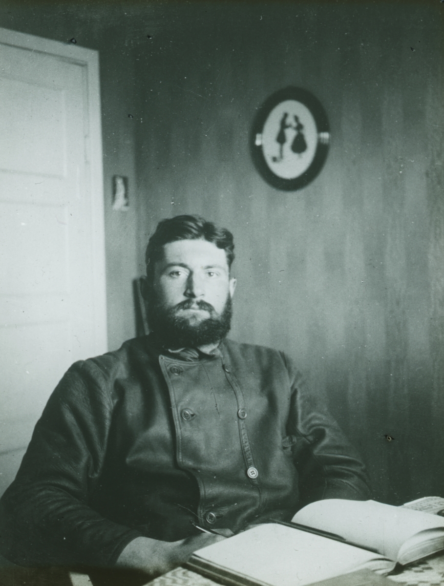 Fotografi från Spetsbergen. Motiv av skäggig man som sitter inomhus vid bord och läser en bok.