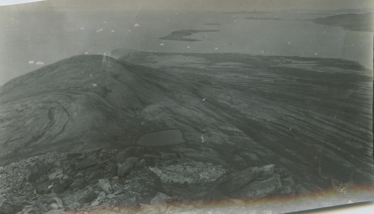 Fotografi från expedition till Östgrönland 1929. Dansk-svensk expedition under ledning av Lauge Koch. Svenska deltagare: Oscar Kulling och Helge Backlund. Vy över berg och is.