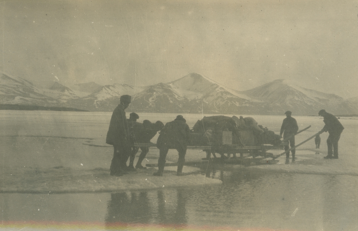 Fotografi från expedition till Spetsbergen. Motiv av ett antal expeditionsdeltagare som drar en fullastad släde över isen. I bakgrunden syns vidsträckta snötäckta berg.