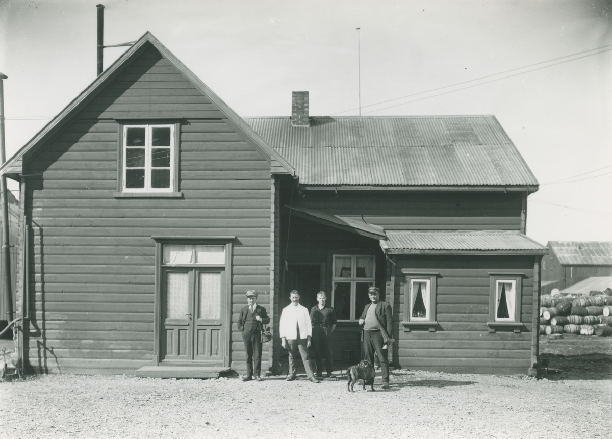 Bild från expedition i Antarktisområdet. Motiv av fyra män och en hund framför ett hus.