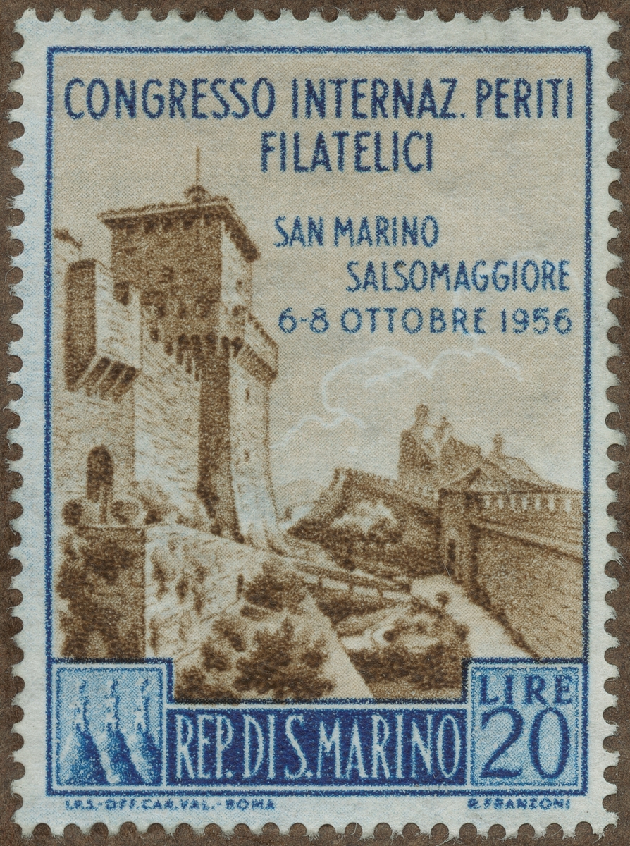 Frimärke från San Marino, 1956. Motiv av Slottsbyggnad i San Marino Internat. Filatelistkongressen 6-8 okt 1956