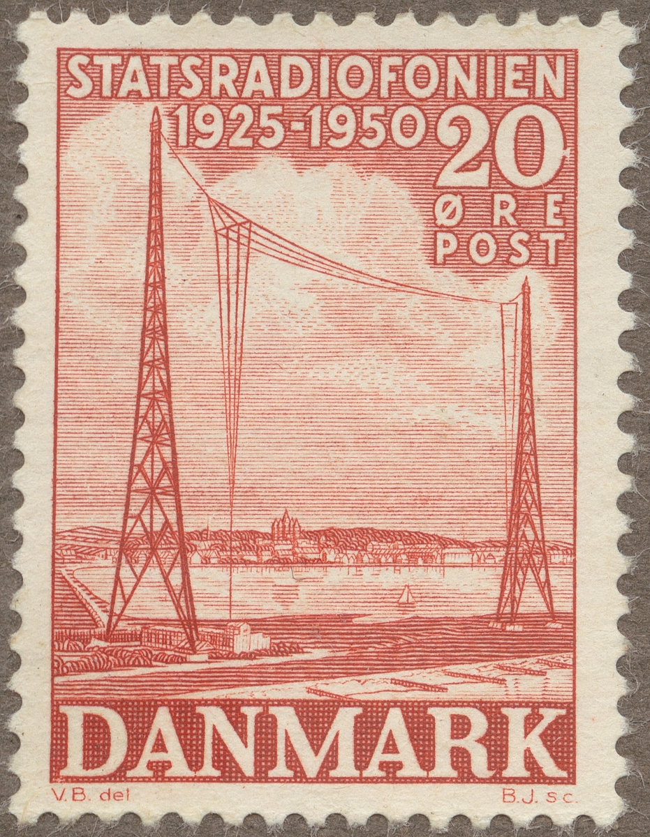 Frimärke ur Gösta Bodmans filatelistiska motivsamling, påbörjad 1950. Frimärke från Danmark, 1950. Motiv av Kalundborg Radiostation och radiomaster. "25-årsminne av "Statsradiofonien": -den danska statliga radion. 1925-1950"