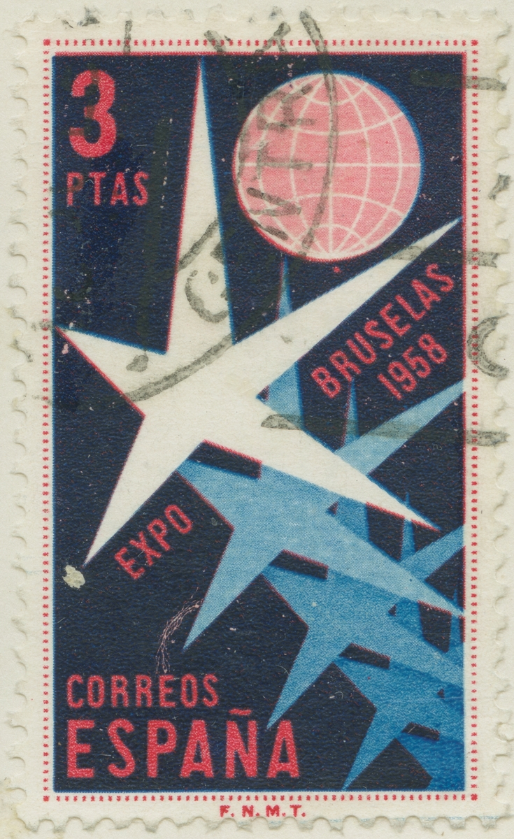 Frimärke ur Gösta Bodmans filatelistiska motivsamling, påbörjad 1950. Frimärke från Spanien, 1958. Motiv av Stjärnsymboler "Bryssel Utställningen 1958"