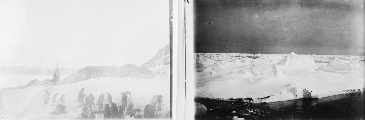 Fotografi från undsättningsexpeditionen med fartyget Uruguay 1903. Stereofotografi med motiv av pingviner och isberg.