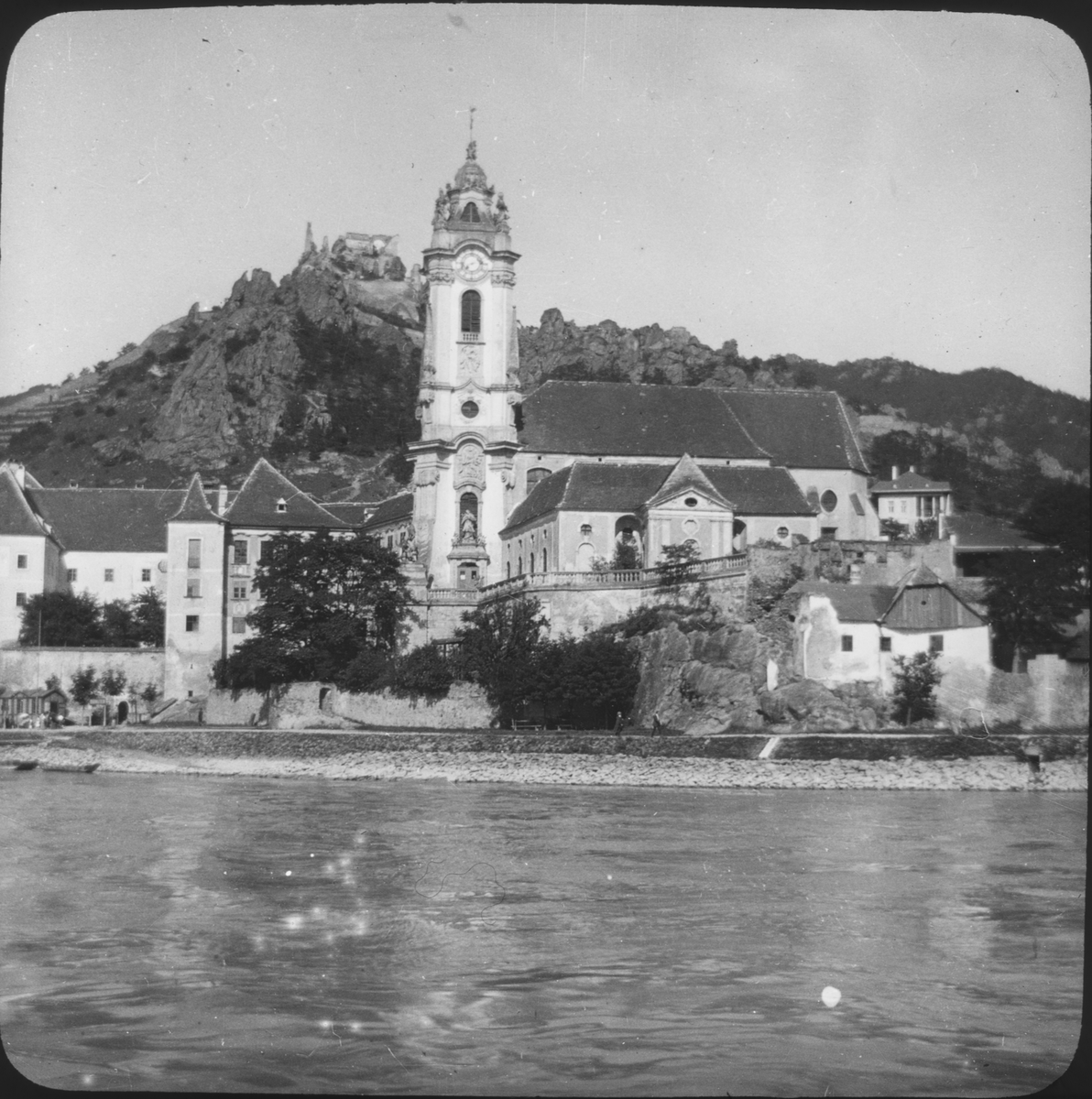 Skioptikonbild med motiv från Durnstein vid stranden av Donau i Österrike.På bilen syns den blå kyrkan, Die blaue Kirche.