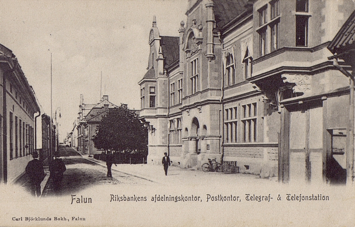 Vykort. Falun Riksbankens avdelningskontor, postkontor, telegraf och telefonststion. (Förlag: Carl Björklunds bokhandel, Falun).