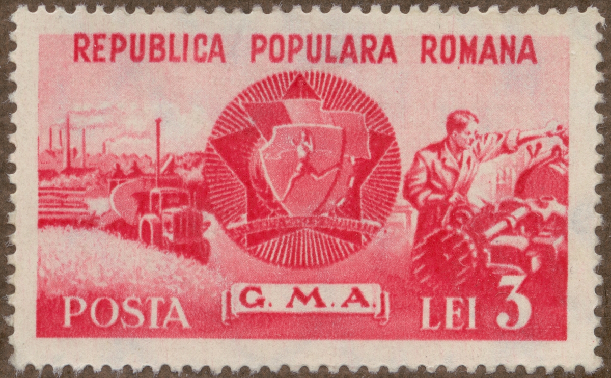 Frimärke från Rumänien, 1950. Motiv av Lantbruksarbete Mekan. Arbete Idrott