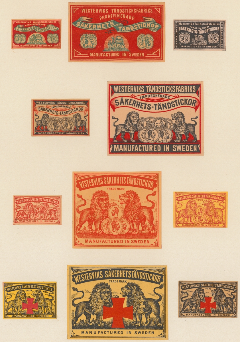 Etiketter för tändsticksaskar, från Svenskt Industri- och Handelsmuseum.