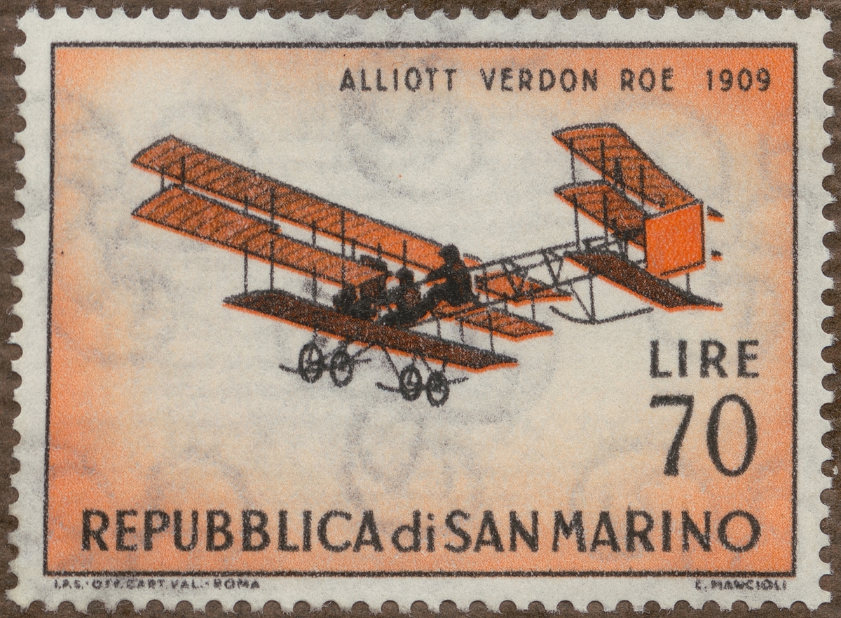 Frimärke från San Marino, 1962. Motiv av Elliott Verdon Roe: 1909 "Serie: Äldre flygplanstyper"