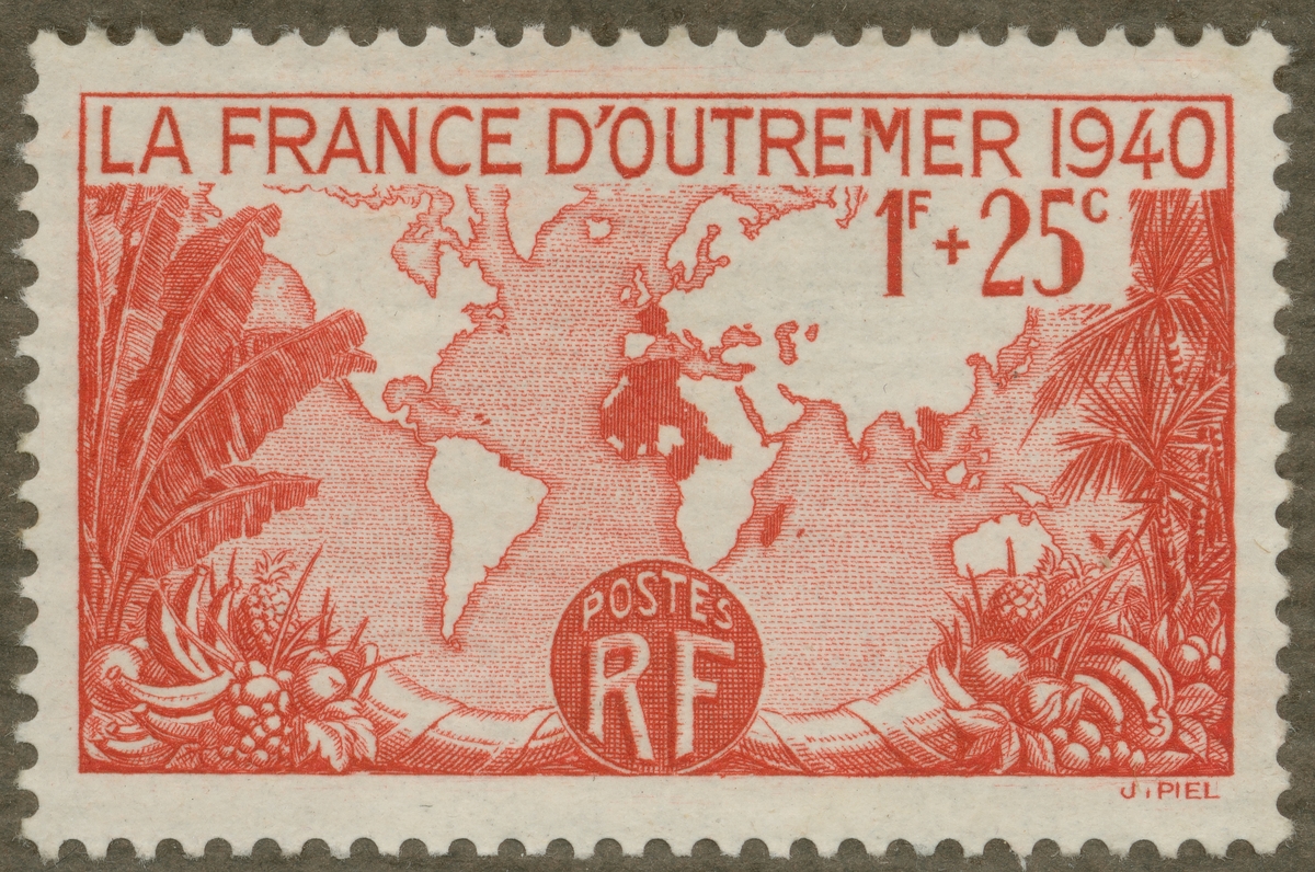 Frimärke från Frankrike, 1940. Motiv av världskarta över Frankrike och dess kolonier.