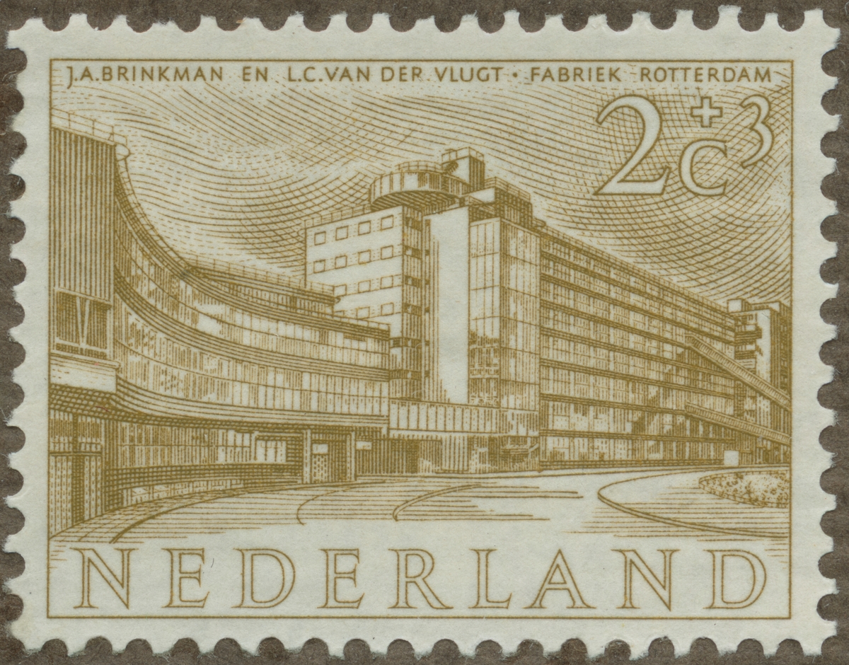 Frimärke ur Gösta Bodmans filatelistiska motivsamling, påbörjad 1950. Frimärke från Nederländerna, 1955. Motiv av "J.A.Brinkman och L.C. van der Vlugt Fabriken i Rotterdam"