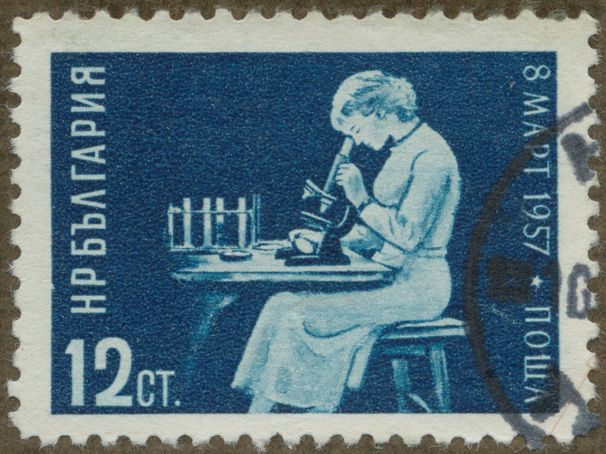 Frimärke ur Gösta Bodmans filatelistiska motivsamling, påbörjad 1950. Frimärke från Bulgarien, 1957. Motiv av Kvinnlig laborant vid mikroskop "Kvinnornas Dag: 8 mars 1957---"