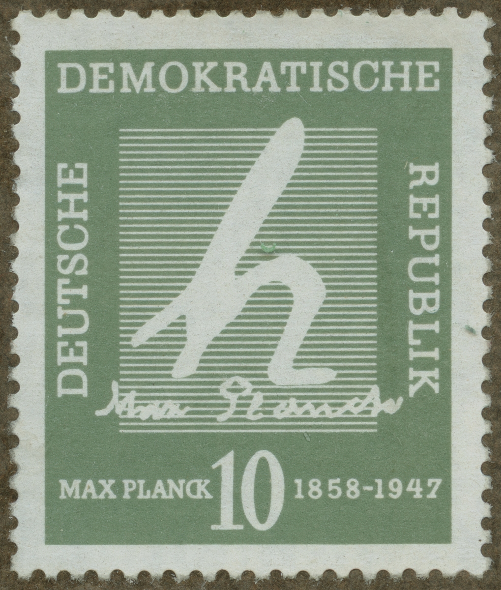 Frimärke ur Gösta Bodmans filatelistiska motivsamling, påbörjad 1950. Frimärke från Öst Tyskland, 1958. Motiv av "h" : "-Symbol för Plancks kvantlag- Max Planck: 1858-1947 Tysk fysiker. Uppställde kvant-teorin. Värmestrålning Nobelpris i fysik 1918 -100-årsminne av hans födelse-"