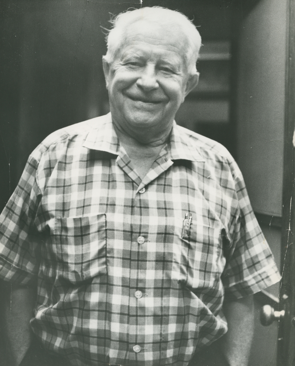 Fotografi från låda märkt Bernt Balchen. Balchen var norsk-amerikansk flygare, polarforskare och militär. Porträtt av Bernt Balchen iklädd rutig skjorta.