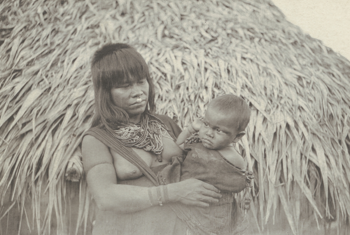 Fotografi från kuvert märkt med "Ernst Nordenskjöld". Motiv av kvinna med litet barn i famnen framför hydda med halmtak.