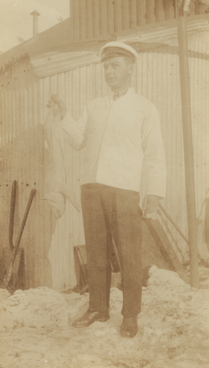 Bild från expedition i Antarktisområdet. Motiv av man som håller i en död griskulting, 1930.