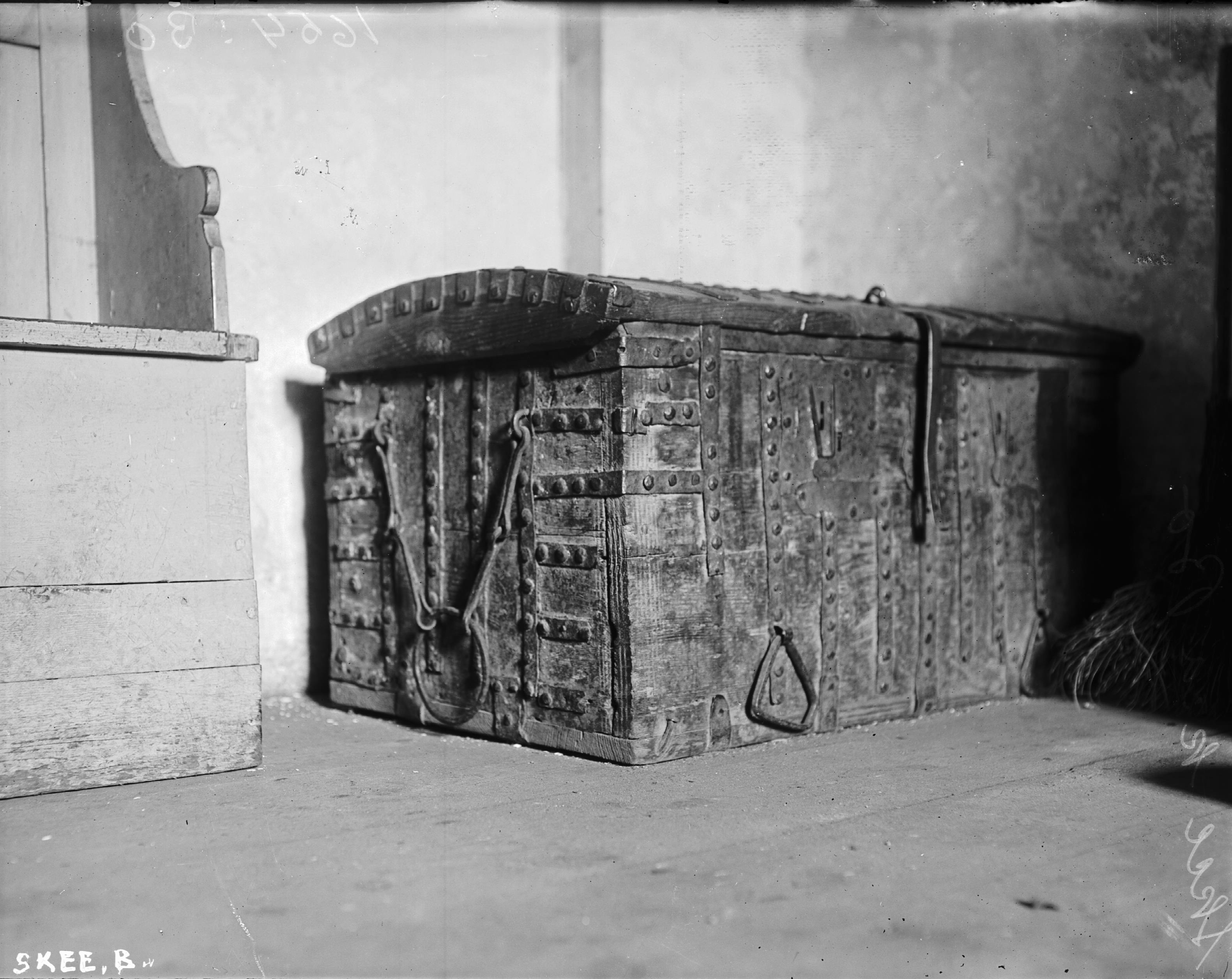 Kyrkkista av furu med rika beslag. Kedjehandtag. 1700-talet ? Snabbinv.