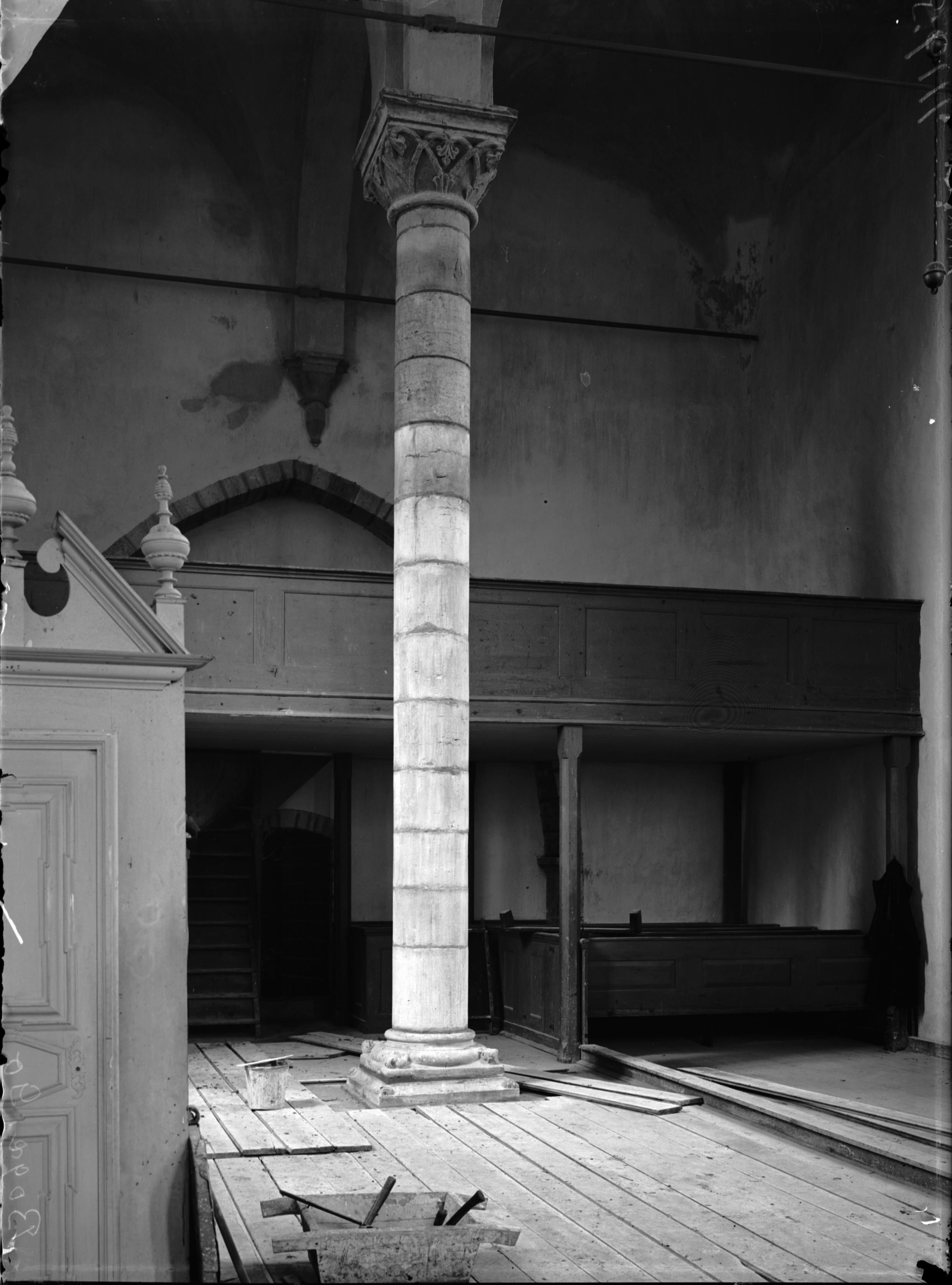 Läktaren före borttagandet och den nyuppsatta pelaren.