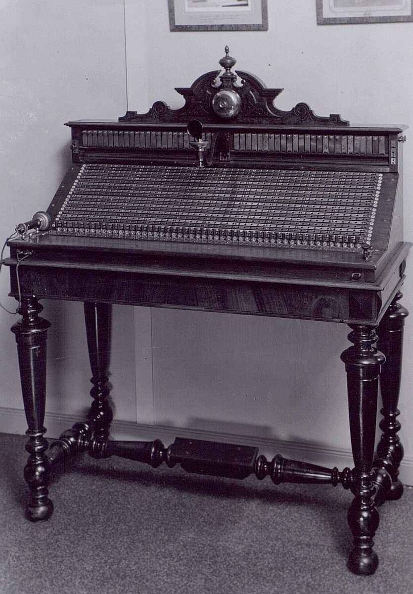Växelbord, LME-tillverkat i början av 1880-talet. Med metallskenor och lösa proppar, fast mikrofon och hörtelefon.