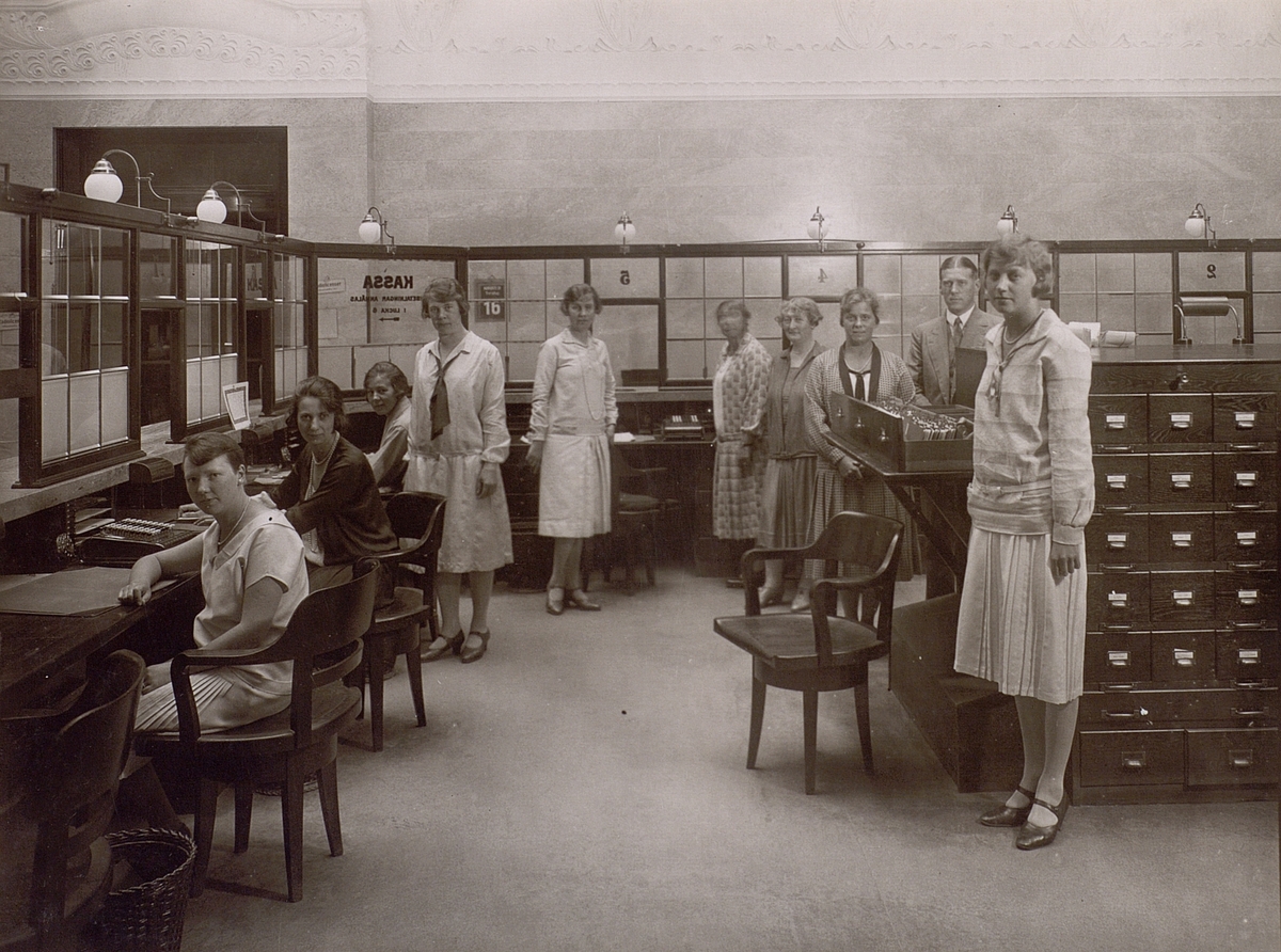 Telefonstation i Stockholm år 1926. Abonnemangsbyrån Brunkebergstorg. Näst längst till vänster ass S Lundell.