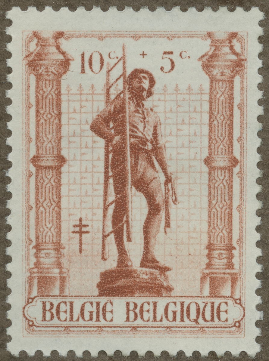 Frimärke från Beligen, 1943. Motiv av Belgisk taktäckare. "Serie av olika yrken till förmån för Tbc-vården".